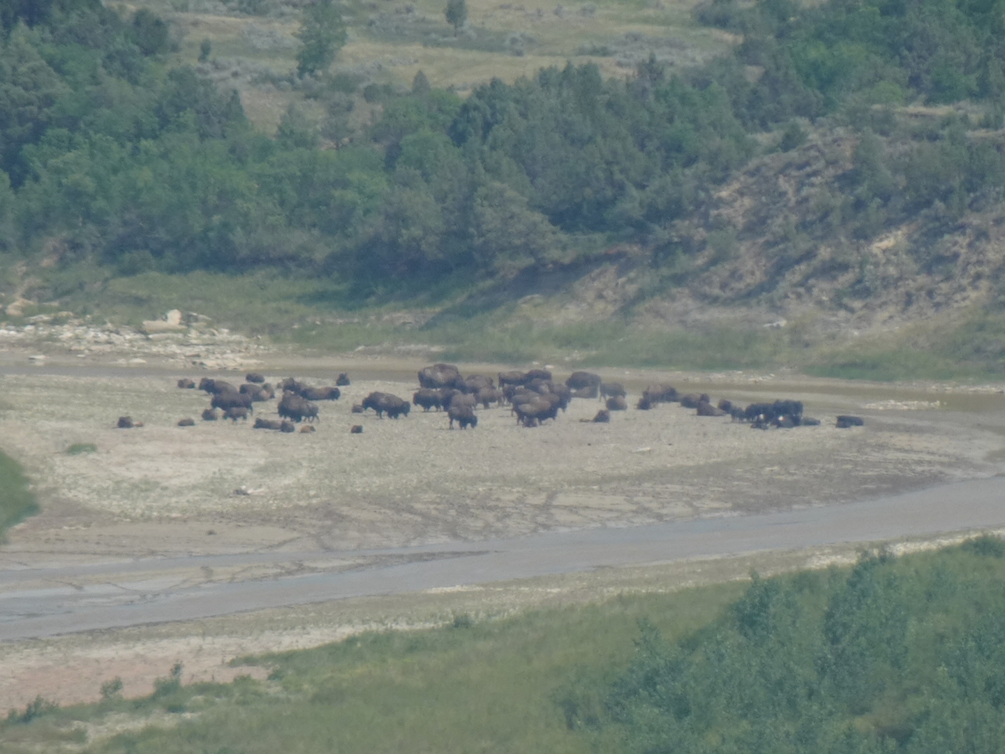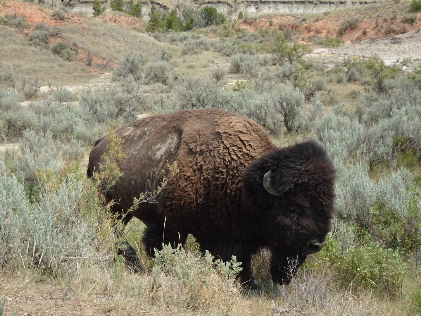 We had arrived when the light was just right for showing off the varigated layers of rock caused by millions of years of erosion. The Little Missouri River flows through the park, and at one lookout we realized we could see a large herd of bison along the edge of the river in the distance.